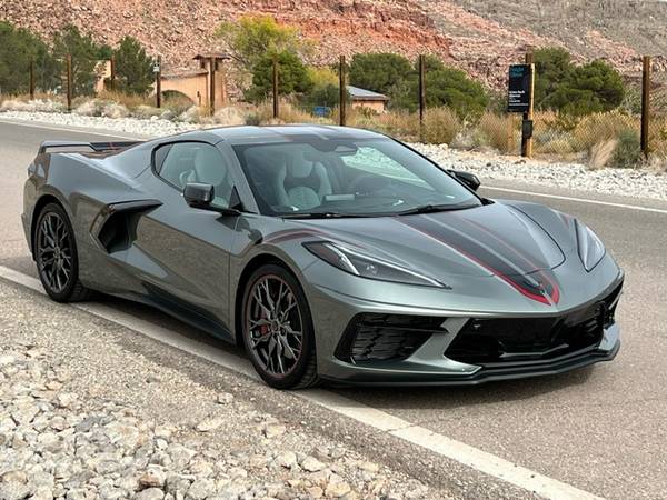 2024 Chevrolet Corvette 2LT coupe Z51 w/GT2 seats, Hypersonic Gray, Sky Cool Gray interior, Front lift adjustable height memory, magnetic selective ride, 20 spoke carbon flash-painted forged aluminum wheels with red stripe, edge red calipers full length dual racing stripes flash metallic w/edge red pin stripe, fender hash stripe with same colors, performance exhaust, edge red engine cover, painted top (no dual tops) and many more options.