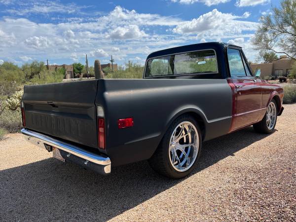 1968 Chevy C10 factory short bed not cut, 6.0L LS engine, headers to dual exhaust, 4L80 Transmission, 12 Bolt rear end, power disc brakes all corners with big Corvette front rotors and calipers, QA1 front fully adjustable, coil over suspension, aluminum fuel tank relocated, under the bed, New wiring harness throughout, Dakota digital gauge cluster, Air conditioning, Ron Davis, big aluminum radiator with duel electric fans, BOSE 20 inch wheels with Continental Control Contact Sport Tires 255/45/20s in front and 275/40/20s on the rear. Solid Arizona rust free truck. Turn key reliable and great to drive. These are basic pictures. Call or text for more details. Clean Arizona title in hand, $40k