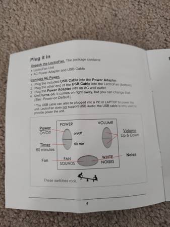 Pre-owned, barely used, no cosmetic defects noted, all parts in tested working condition. This white, LectroFan white noise machine comes complete with USB charger, AC adaptor and Owners Manual, features 60 min Timer Button, 10 Fan Sounds and 10 White Noise Pitches. Perfect for aiding sleep and during travel. Comes in sturdy white gift box