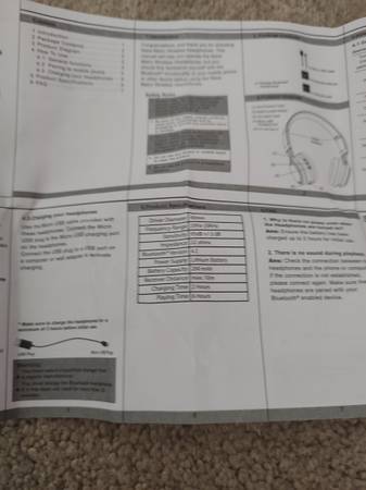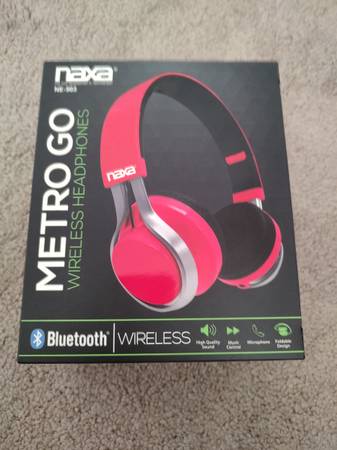 Brand new, never been used, in original box packaging, opened only to take photos. This pair of red, bluetooth wireless headphones features a built-in microphone, rechargeable Li-ion battery that provides up to 6 hours of play time, and call/redial/volume control with Bluetooth enabled devices