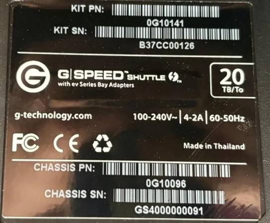 up for sale is a G-Speed Shuttle 20 Tb/To 0G10141 Storage Solution Enclosure Only.............It's in Good Condition but Does Have Some Scratches