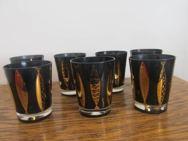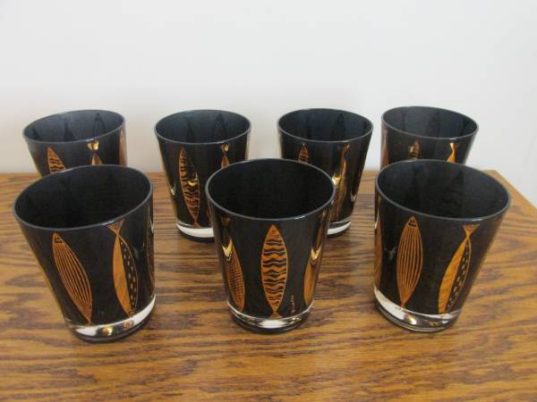 1950's Set Of 7 Fred Press Black With 22K Atomic Gold Fish Designed Low Ball Cocktail Glasses. These Glasses Were Designed And Made Between 1953 To 1955 (Over 70-Years Old). Each Glass Is Signed By Fred Press In 24K Gold. You will not find these at any department stores because they are old and not made in the last 70-years.