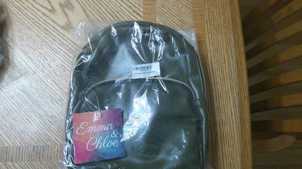 (2) NEW-NEVER USED-Mini travel backpack purses by "Emma & Chloe". One is green in color the other is black in color. Dimensions of 10" (H) x 3" (D) x 8" (W). Made of vegan leather and has...