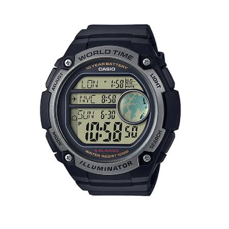 Casio Digital Men's Watch 3447 AE-3000W is a stylish and functional timepiece suitable for travel, sports, casual outings, and everyday wear. With a sleek silver case and all black bezel and bracelet, it features a world map dial pattern with Arabic numerals, making it a practical choice for those who frequently travel or have a busy lifestyle. This watch also includes features such as water resistance, backlight, alarm, and world time functionality, ensuring you stay on schedule wherever you go.