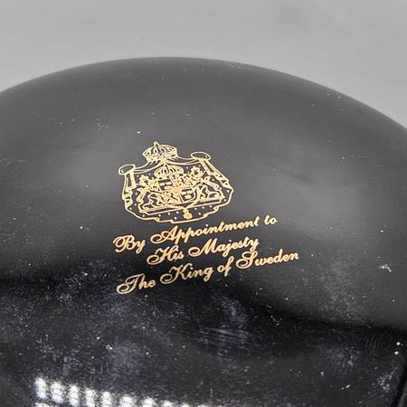 Quality made of carminic and baked for durability. Metal parts (hinge and lock are strong with seal made of rubber for a good air tight seal. The lid has gold markings "By Appointment To His Majesty the King of Sweden"