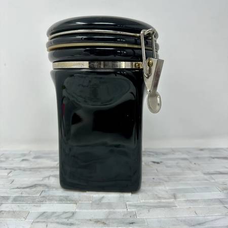 Step up your coffee storage with this vintage Gevalia Kaffe Ceramic Coffee Canister. Standing at 7.75 inches tall, this elegant black canister is accented with gold trim, adding a touch of sophistication to your kitchen. Perfect for keeping your coffee fresh, it’s both stylish and functional, making it a must-have for any coffee lover or vintage collector.