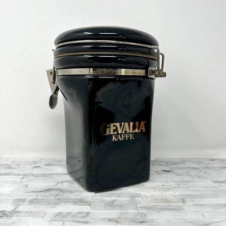 Like New: Gevalia Kaffe gold trim black canister with metal hinge and locking lid. This is an original coffee canister from Gevalia Kaffe. These were made in the late 1980's to the mid 1990's. Measures approximately.; 7.5 inches high x 5.5 inches wide .