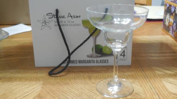 Brand New Margarita Pitcher, Glasses (8), tables, and Salt Rim/Salt Storage Box all by Steve Azar. Clear glass 2 quart beverage pitcher, 8 glasses (10 oz), (2) margarita tables, and wooden margarita salt rimmer cocktail kit. (6.3" diameter). ALL for only $12.