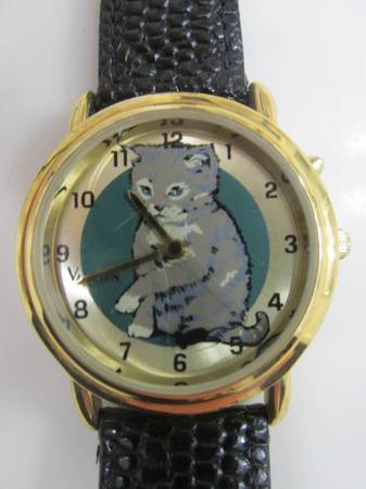 Very rare running watch with unique sound of meowing cat that has a realistic cat meowing sound when side button is poshed. The watch dials is 1-1/2 inches in diameter. I takes 3 small hearing aid batteries. This is a unique and adorable vintage watch with working quartz movement! Minute hand mouse runs around kitty cat.