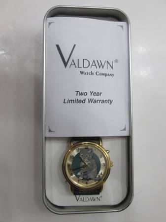 Never Worn: Woman's "Meowing Cat" watch as small mouse runs around as the minute hand of the watch. This is a vintage watch from the mid 1980's made by the Valdawn Watch Company and has a black leather band. This wristwatch is perfect for women who appreciate a touch of whimsy in their accessories.
