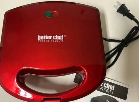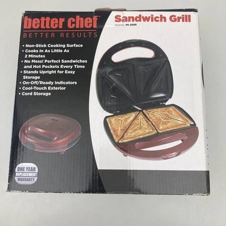 New: Better Chef Electric Sandwich Grill With Non-Stick Surface. No Mess1 Makes Perfect Sandwiches, And Hot Pockets Every Time. Non-Stick Cooking Surface Cooks In As Little As 2 Minutes. Easy Clean Ups! This can be used or given to someone as a gift because it is brand new.