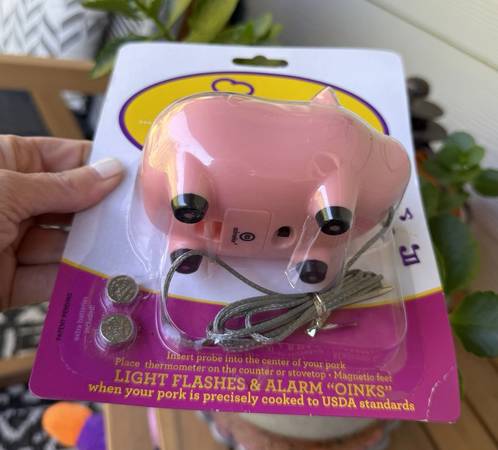 New In Original Package: Chef Pal's Pork Thermometer Digital Light Thermometer Flashes & (OINKS" Sounding) Alarm When Temperature Is Reached. Made with stainless steel and plastic with magnetic feet. It is designed with a pink color that is perfect for adding a pop of color to your kitchen.
