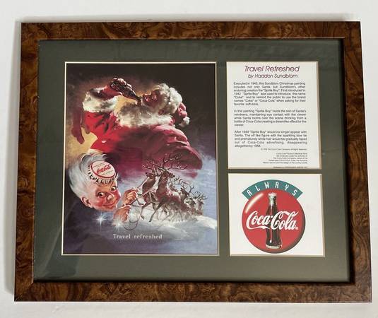 This Coca Cola Collectible Christmas Sprite Boy Print "Travel Refreshed" by Haddon Sundblom 1945 Excellent/ Like New showroom condition. Executed in 1945, this Sundblom Christmas painting includes not only Santa, but Sundblom's other enduring creation the "Sprite Boy". First introduced in 1942 "Sprite Boy" was used to introduce the name "Coke" and to remind the public to use the brand names "Coke" or "Coca-Cola" when asking for their favorite soft drink. In this painting "Sprite Boy" holds the reins of Santa's reindeers, maintaining eye contact with the viewer while Santa looms over the scene drinking from a bottle of Coca-Cola creating a dreamlike effect for the viewer. After 1949 "Sprite Boy" would no longer appear with Santa. The elf like figure with the sparkling bow tie and prematurely white hair would be gradually phased out of Coca-Cola advertising, disappearing altogether by 1958.