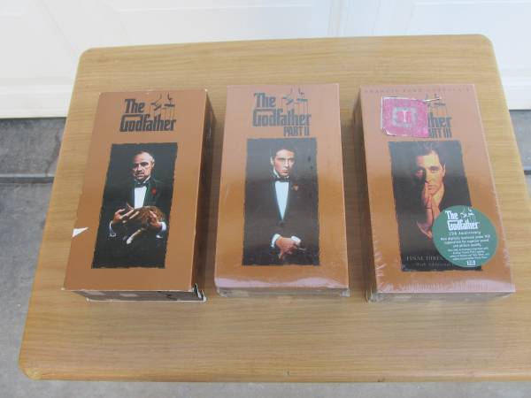 New: VHS Godfather Collection; Part 1, 2, 3, (2Tape Set Each). Part 1 is open, part 2 and 3 are new and sealed in plastic.