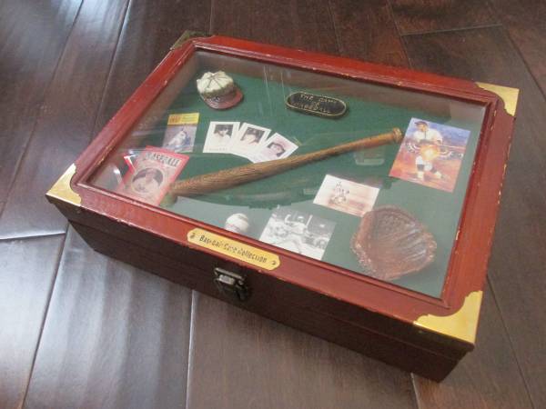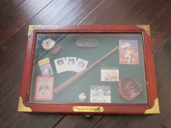 Vintage looking wooden shadow box with glass front displaying "The Game Of Baseball" Items; including miniature baseball stuff on the top display section and on the bottom has 8 separate compartments that can hold over 50 normal size baseball cards inside each.