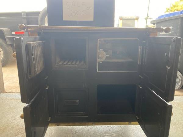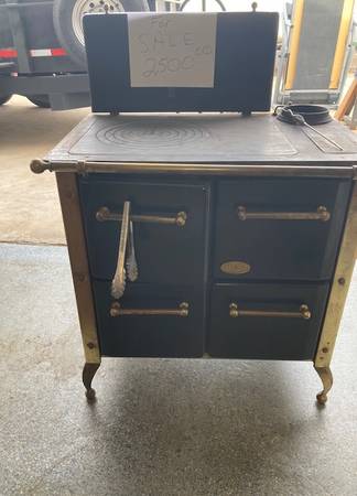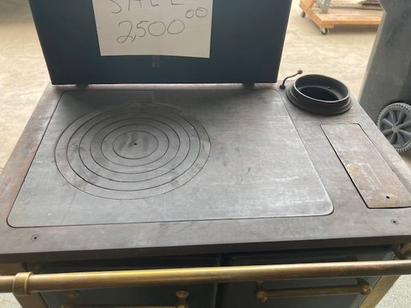 The wood stove is 33 inches wide and 25 inches deep. It stands 33 1/2 inches from floor to cook top. Then there is a 12 inch high backsplash that is about 24 1/2 inches long that ends on the upper right corner where the stove pipe comes out. The stove pipe is 6 inches in diameter. We do not have the stove pipe. We will include the Magic Heat hot air recycler. Estimate that it weighs about 500 pounds.