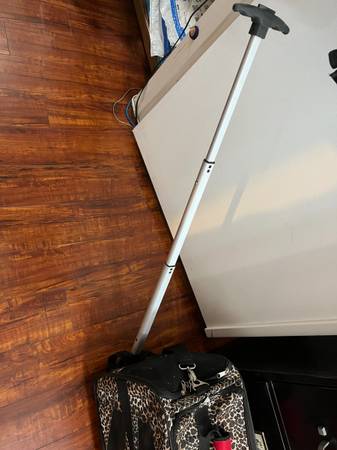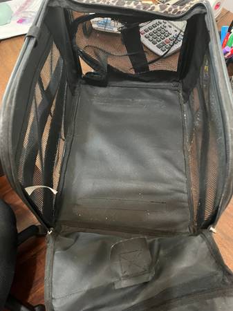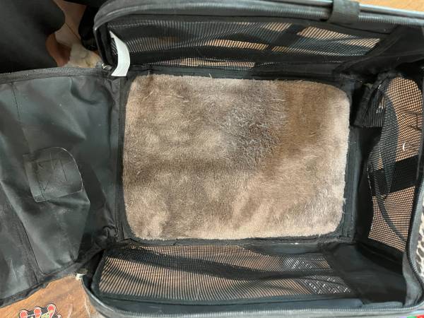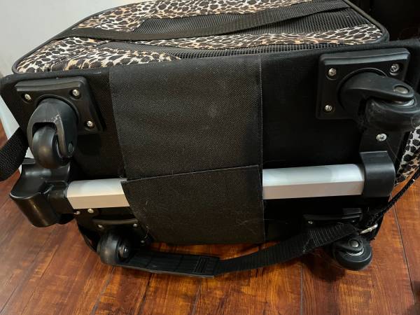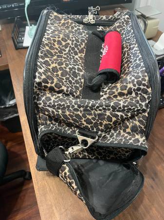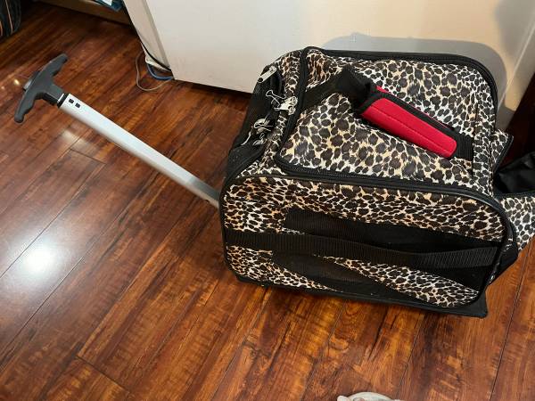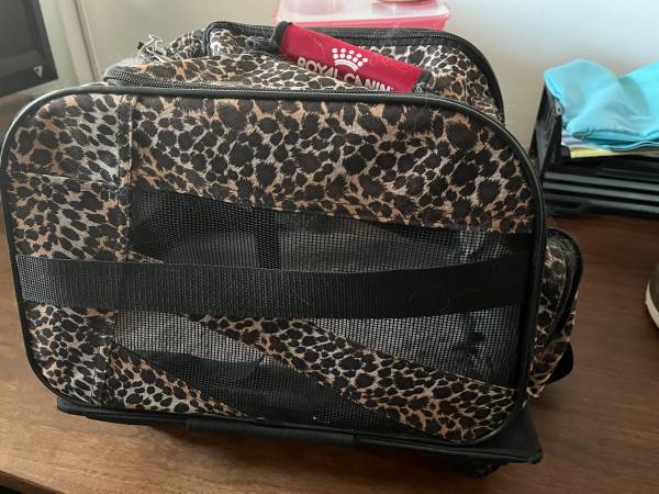 Leopard print rolling cat carrier with several zipper openings, screens, side pockets and furry pad inside. No extra charge for extra cat hair :)