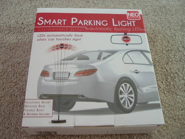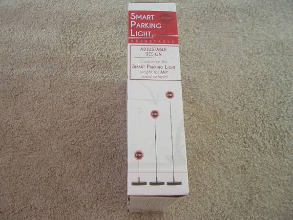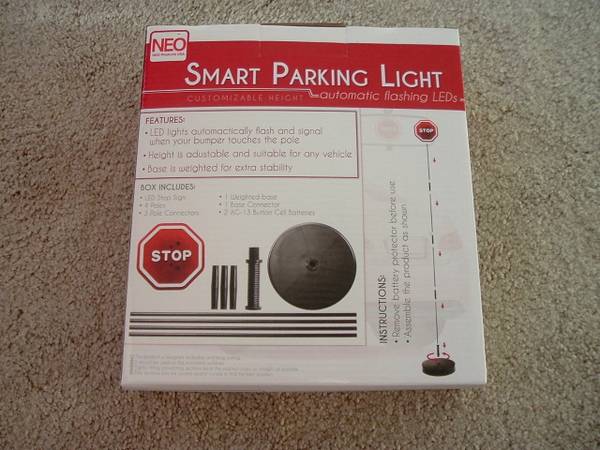 Brand new, never opened or used, in original box packaging. This helpful parking accessory features adjustable height for any size vehicle, weighted base for extra stability, LED lighted STOP sign flashes when your bumper touches the flexible pole, batteries included