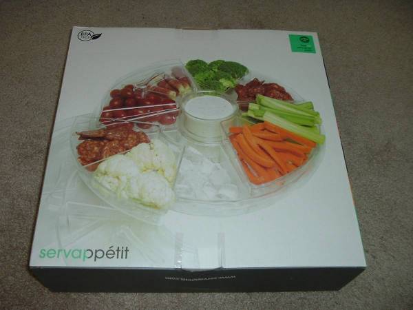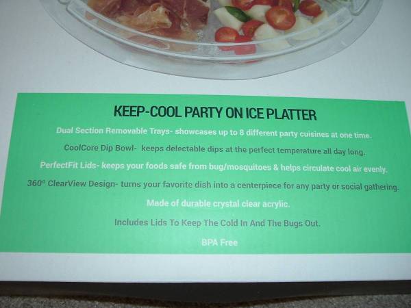 Brand new in original packaging. This divided, clear acrylic platter provides 8 removable trays for different party foods plus dip bowl in center, allows food to be served over ice, keeps food cold and safe, includes perfect fit lid to keep the bugs away, BPA free. Handy for the beach, picnics, backyard parties.