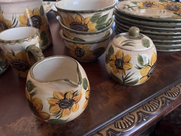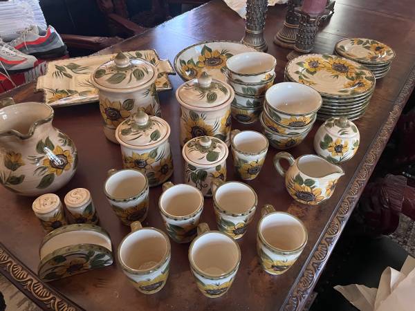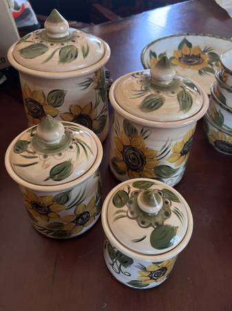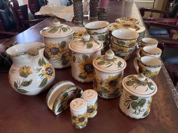 Selling or Trading . Beautiful Sunflower set . 8 big plates , 7 smaller plates , 7 soup or cereal bowls , 7 mugs , 4 different size canister set ( Jars ) , big offering Bowl , Salt and Pepper ,...