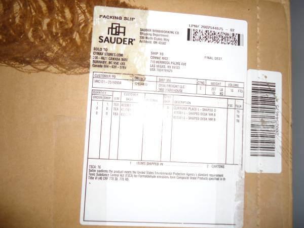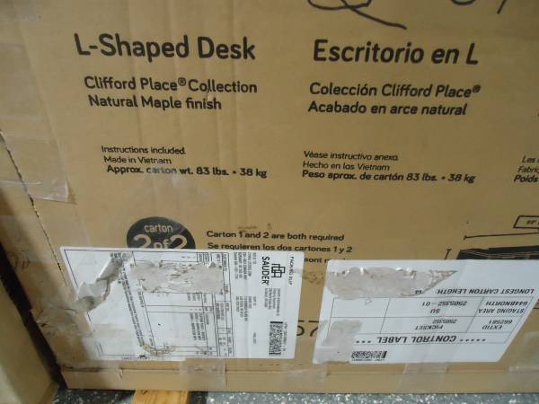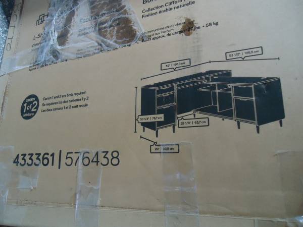 For your consideration is a Sauder L shaped 5 drawer office desk. Model # 433361. The dimensions of this L shaped desk are as follows: The longest of the L sides is 59 inches. T he shorter of the two L sides is 53 and a half inches. The depth of the desk is 20 inches. The height of the desk is 30 and a quarter inches. Besides for the unique 5 drawer configuration there is also plenty of storage space under the work top of the desk. Sauder calls the color of the desk light pine. Those familiar with the Sauder brand of furniture, they are the leader of the put together furniture industry. I personally purchased this desk and had it assembled by a gentleman who has worked for me before at the task of assembling furniture day in and day out for a living. I used the desk for 1 year, then moved and downsized. The desk does not fit in my current residence. If you wish I can supply you with the phone number of the gentleman who assembled this desk for me the first time. He comes recommended. The images you've looked at show the L shaped desk assembled in my previous residence. The desk was meticulously disassembled by me and put back in the original Sauder shipping boxes. The desk DOES NOT come with a chair, plants, desk top computers, or pictures of any sort, just the L shaped desk. An assembly booklet comes with the desk.