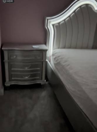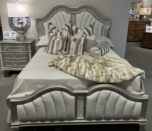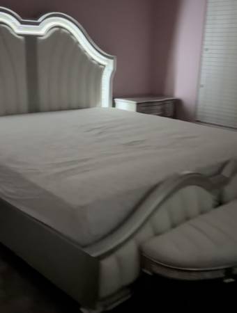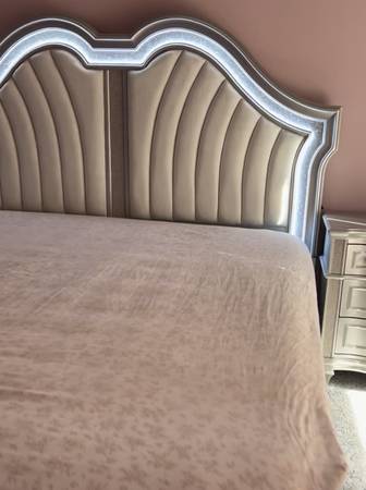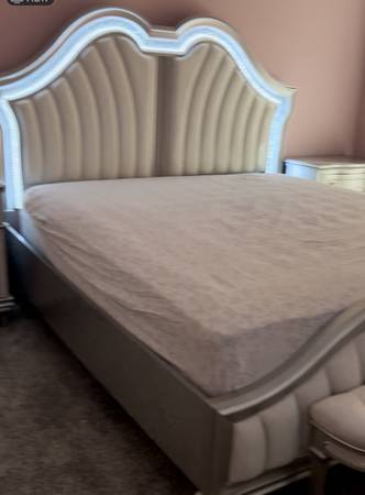 Upholstered & padded with white sparkle fabric and Bling jewels around the frame that Lights up by touch button on sides of headboard GORGEOUS & looks even MORE FABULOUS IN PERSON!!!