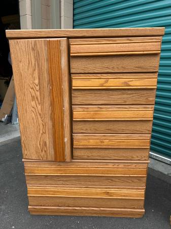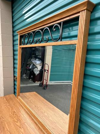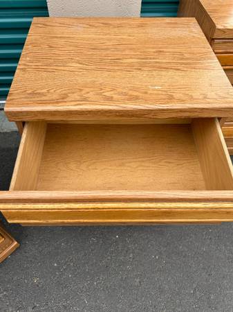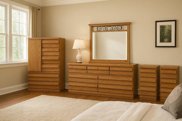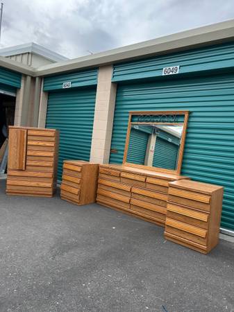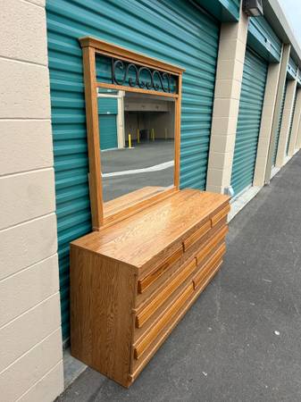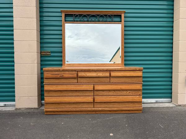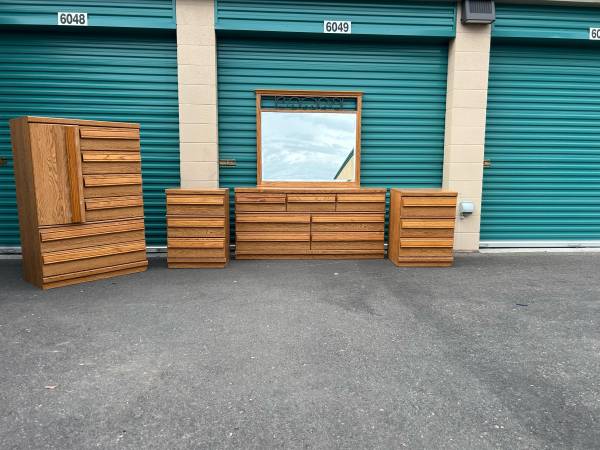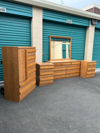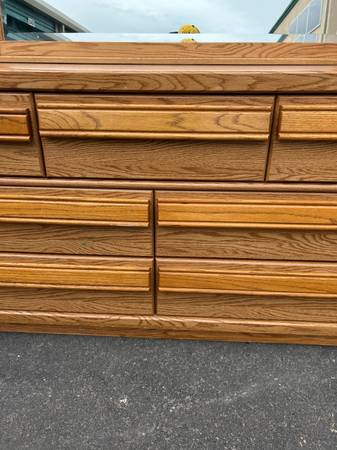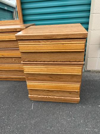 Gorgeous heavy-duty, all-wood bedroom set in great preowned condition. Shows normal use such as small nicks or scratches, but no major damage. Comes from a very clean, smoke-free, pet-free home. All drawers open and close perfectly, interiors are clean, and the mirror is in excellent condition with no cracks.