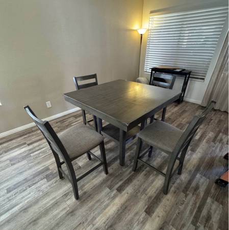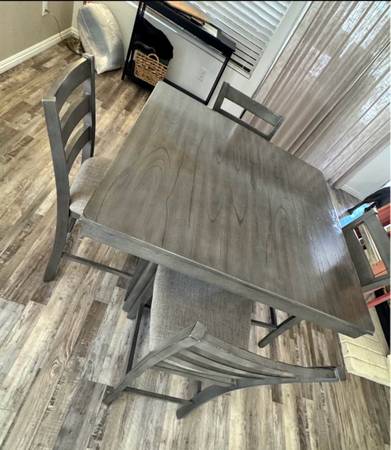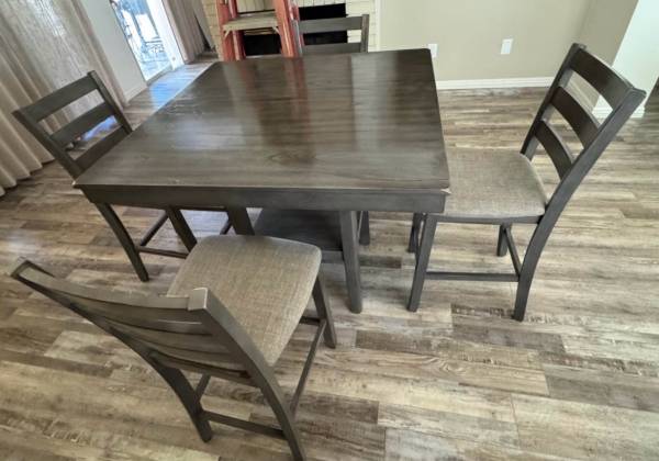 Very nice wood dining table with four matching chairs, preowned but in very good condition. The table may show a minor sign of use here or there, but no major damage at all. It has been removed from its previous home, fully cleaned, sanitized, and wrapped, so it’s ready for its new home.