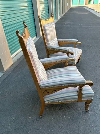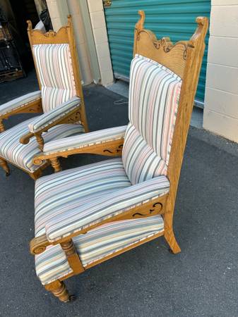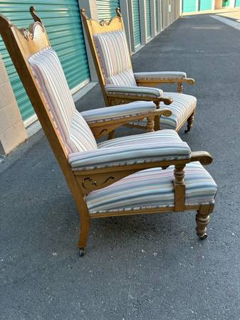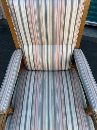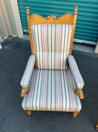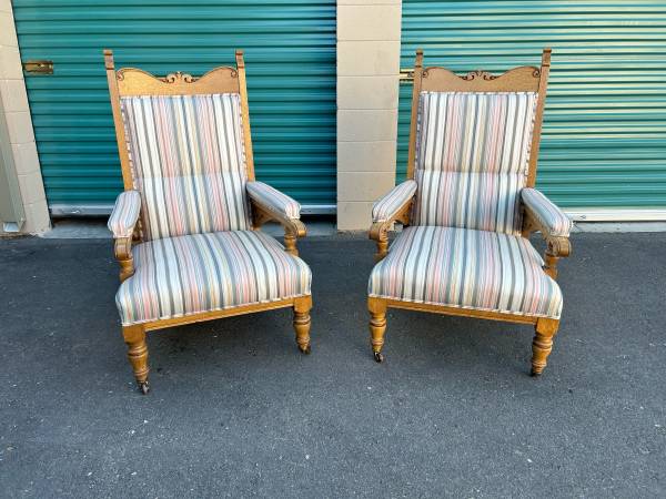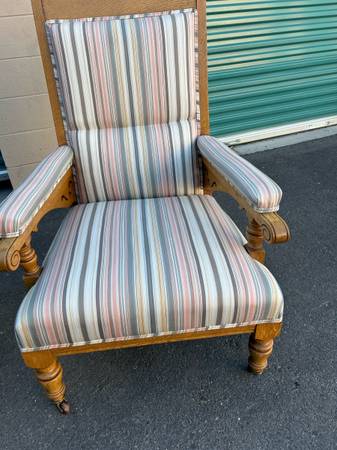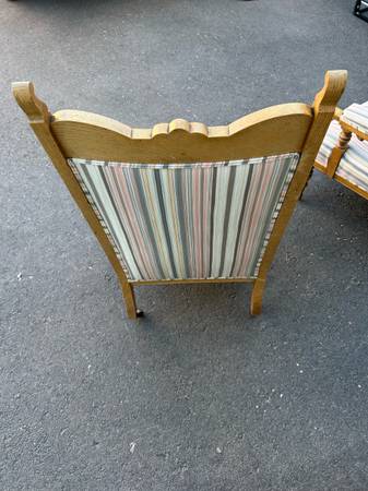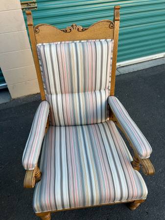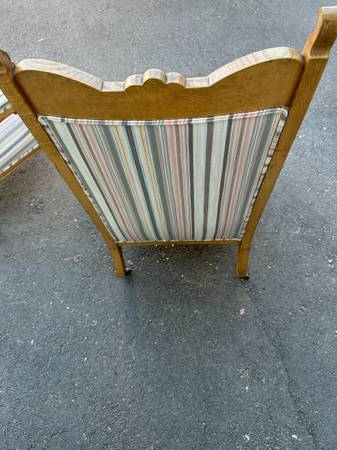 These two stunning vintage-style chairs are preowned but in excellent condition and built to last. Featuring beautiful carved wood frames, elegant striped upholstery, and solid craftsmanship β these chairs bring a touch of timeless class to any living room, office, or sitting area.