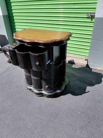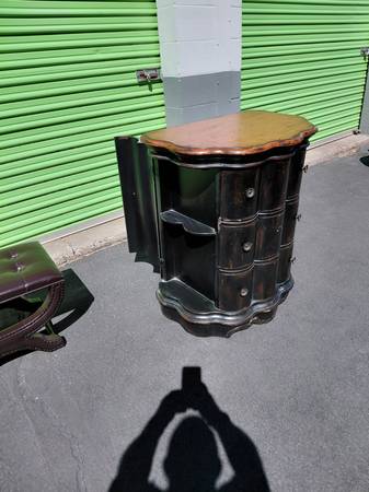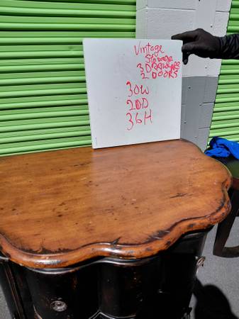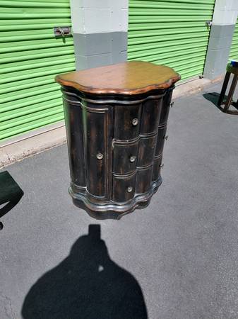 Features: 3 drawers, scalloped design, solid wood construction, distressed black & brown finish