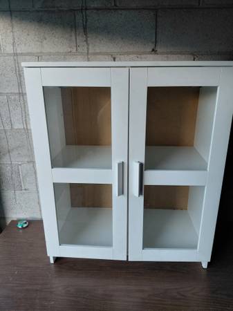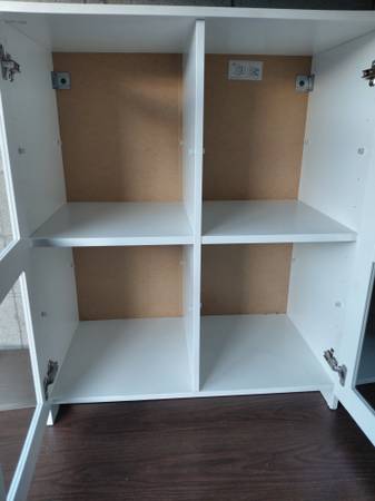 Featuring glass-front doors and four interior compartments, this piece is perfect for bathrooms, laundry rooms, kitchens, craft rooms, or any area where extra organized storage is needed.