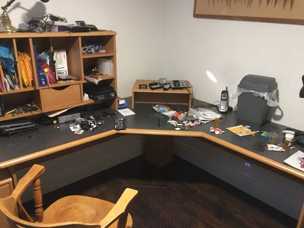 Nice corner desk in great shape, comes with a like new black leather rolling office chair and a floor protector