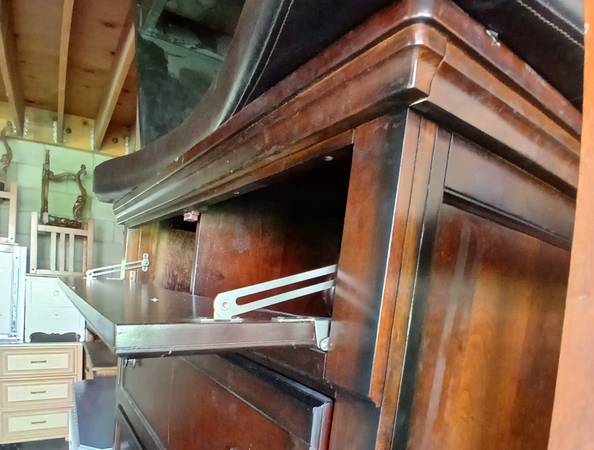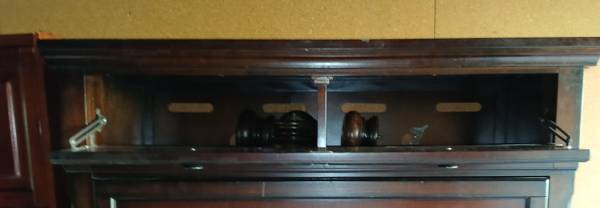 A unique element is the hidden drop-down compartment at the top, which was likely designed as a media cabinet (for DVD players, gaming consoles, or cable boxes). It uses hinged stay-arms to hold the drop-down panel securely when open. Inside, there are cable management cutouts in the back panel.