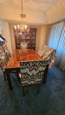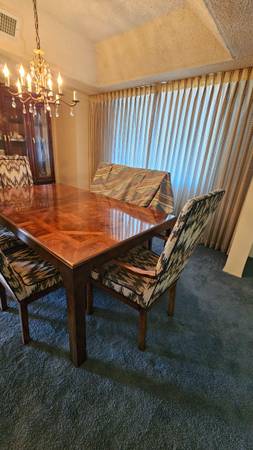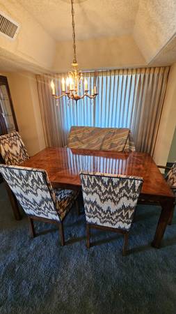 Asking $2k obo for dining set. Paid over $3k originally. Has insertable piece to extend table.