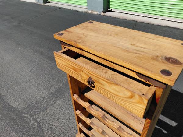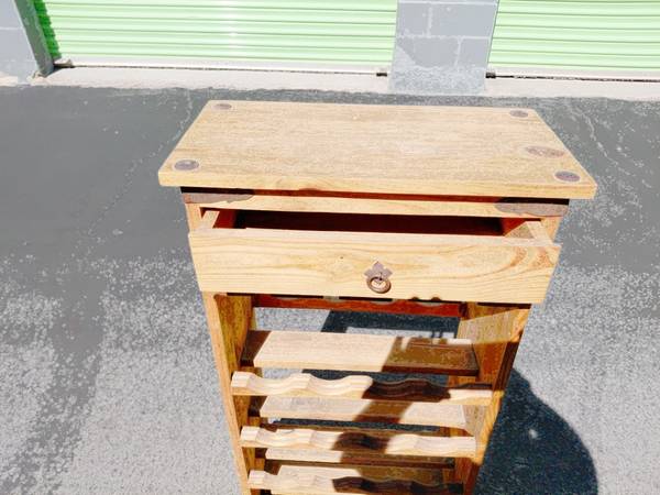 One small pull-out drawer with a decorative metal pull, ideal for corkscrews, stoppers, or bar tools.