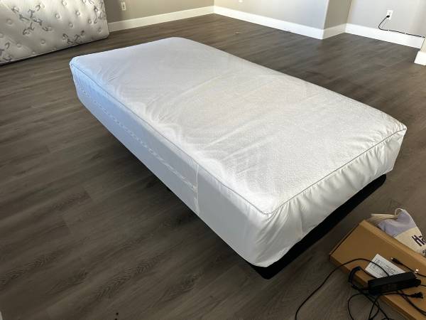 Bobs motorized bed. Twin thick memory foam. Has had a mattress cover since day one. Uses the BOB app.