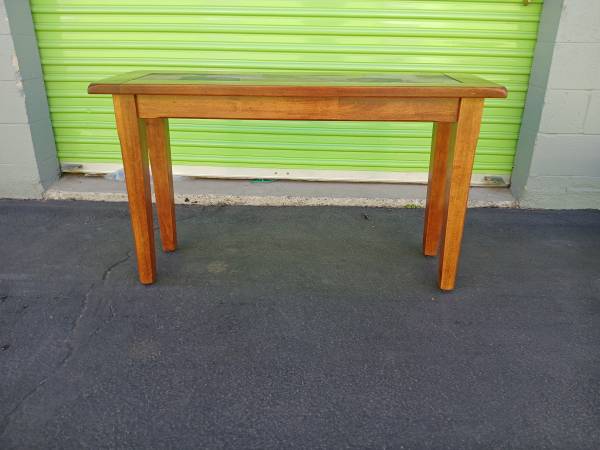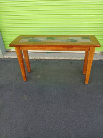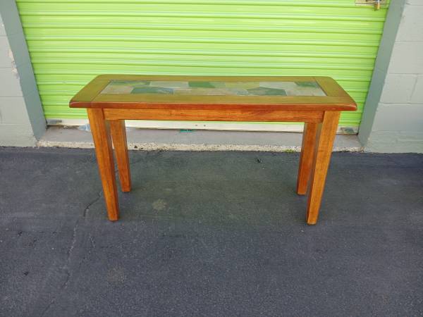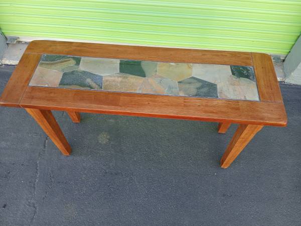 Add a touch of natural charm to your home with this rustic wood console table featuring an inlaid slate tile top. The multi-tone stone tiles bring earthy texture and color, beautifully framed by a warm wood finish. Perfect for an entryway, behind a sofa, or as an accent display table.