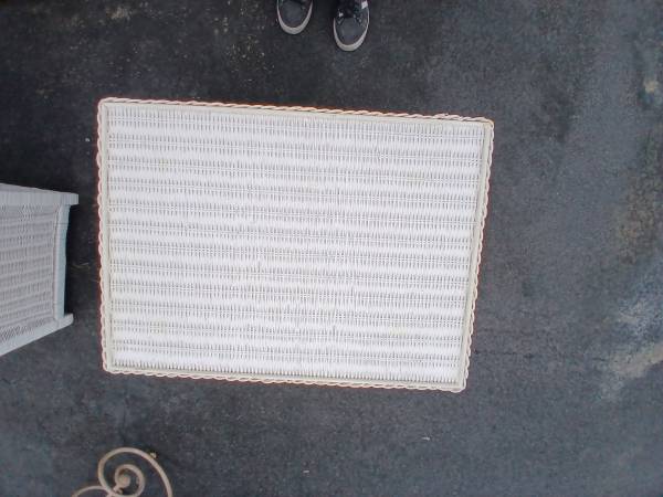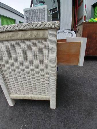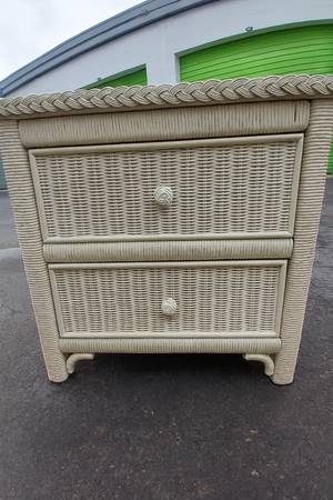Add charm and function to your bedroom with this vintage white wicker nightstand. Perfect for beside the bed or as an accent table, it offers both style and storage.