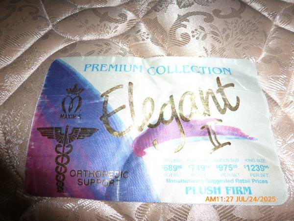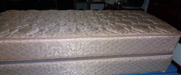 Twin Mattress + Box spring + Rail. In Very good condition, Very comfortable. Orthopedic support. Plush Firm. Always in mattress cover, so No stain No smell . No Kids, No Pets. Must go. Just Rail cost about $40.00. First responder get it. Rail is not on pictures, But it will comes with. As long as you see it, its available. No Deliver. Cash & Pick up Only.