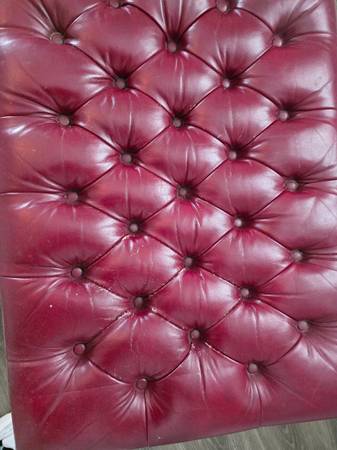 Red leather foot rest from Ethan Allen. Fair condition with some minor wear to the leather, but no rips, cuts, or structural damage, or pet damage. On the bottom is the original tag. Sat in the guest room for nearly 10 years without use, been in the family for at least 25 years. Original chair lost in a move many years ago.