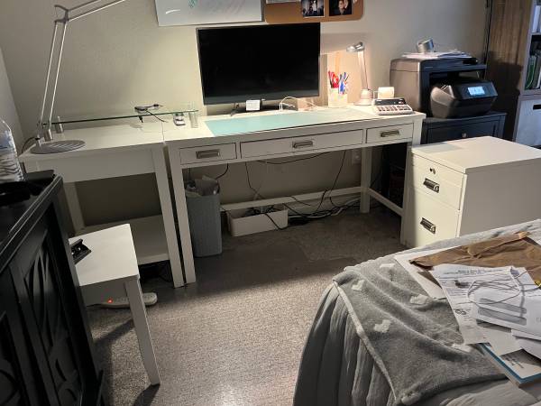 I purchase this desk for over $1000. I am moving and can’t take it with me. The keyboard drawer cover needs to be repaired other than that it’s in excellent condition. Only two years old. Can be sold together or individually