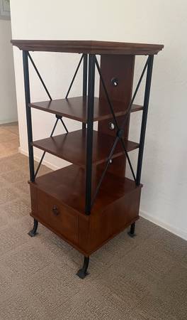 Decorative Stands with Shelving and Storage. Cherry wood and wrought iron. Excellent condition. 19" x 21.5 x 44" high Purchase one for $40. Purchase both for $70.