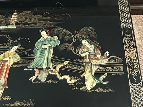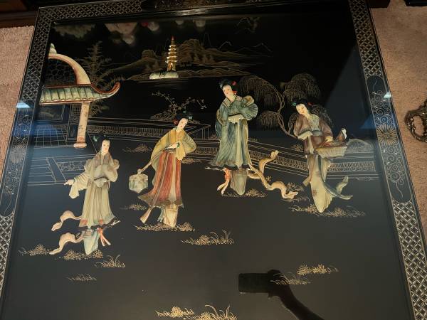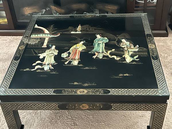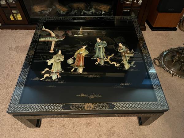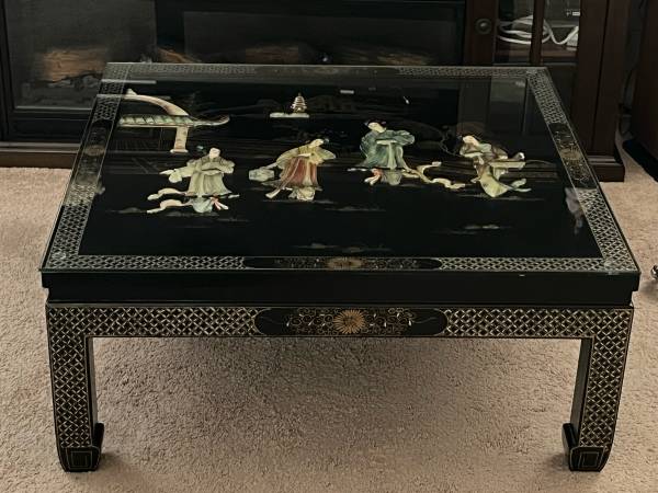 Large Asian Black Lacquer Embossed Chinoiserie Coffee Table With Glass Top 36” X 36” X 15” Tall, Pre - Owned In Good Condition. $250 Please Text Dave Thank You