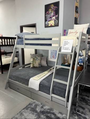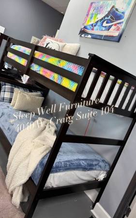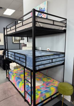 Sturdy twin-over-twin metal bunk beds in good condition. Great for kids’ rooms, guest rooms, or saving space in small apartments. Strong frame with safety rails on the top bunk and ladder included. Easy to assemble and disassemble.