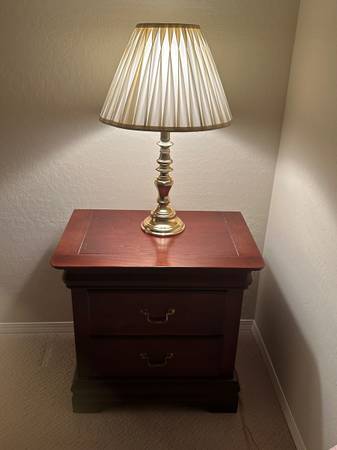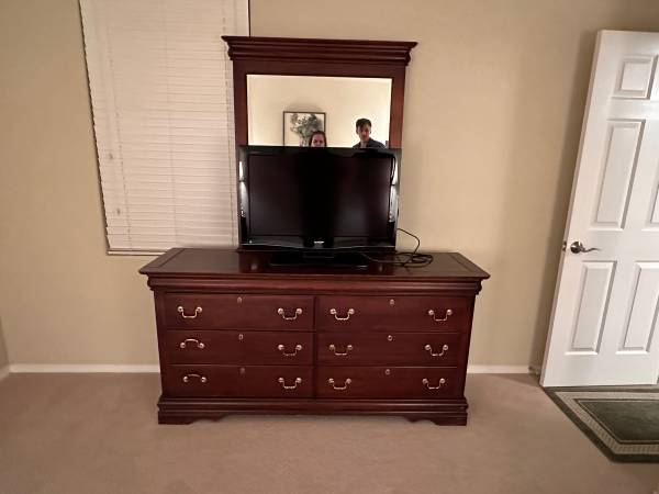 Queen Sleigh bed with like new plush mattress….matching dresser 88”x 19”x 33”, and two side tables 26”x25”x17”by Legacy Classic Furniture, medium cherry finish with traditional brass pulls. Two lamps included Well cared for but signs of normal wear. $375 takes the whole set.