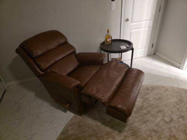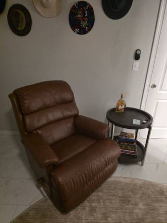 Very comfortable leather recliner Chair Would trade for 2 small barrel/accent chairs