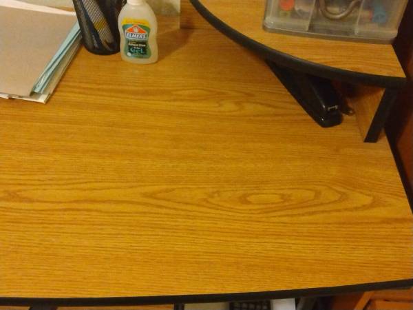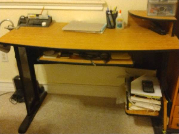 Desk with sliding under desk open drawer.One shelf on the right botton and one small on the right top.