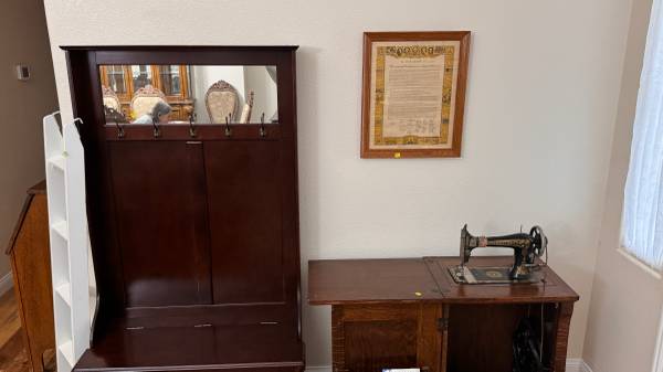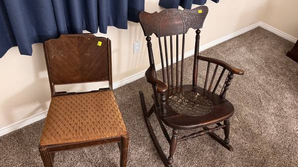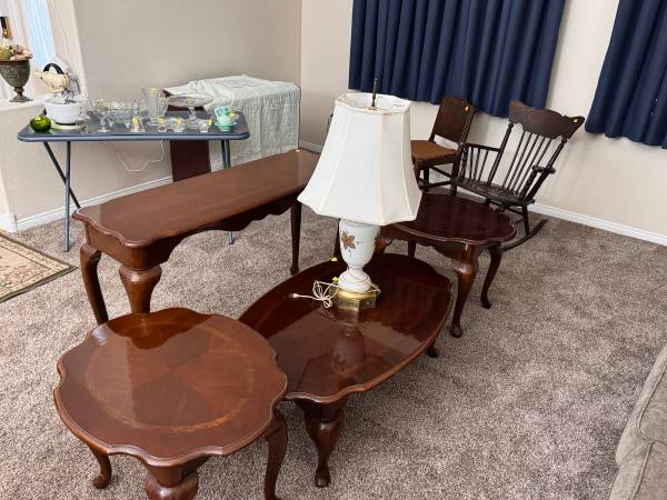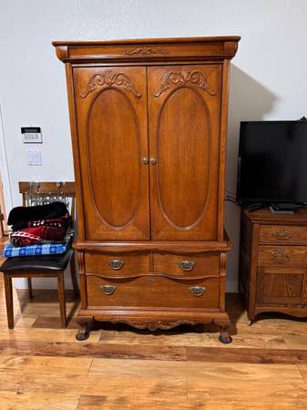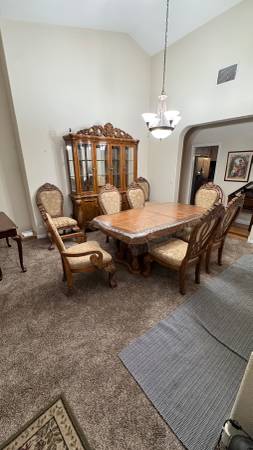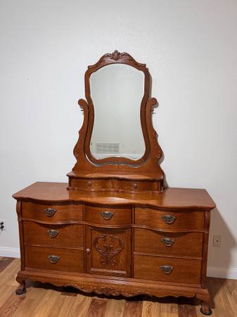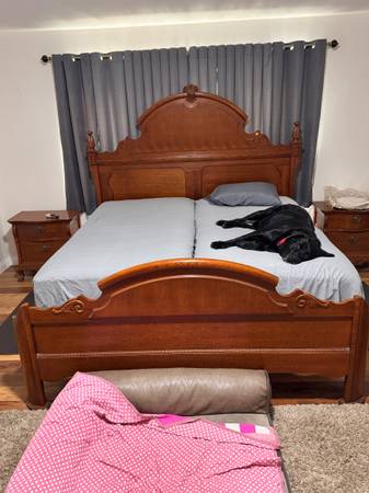 Victorian style oak bed set (king) Nightstands Armoire Dresser with vanity mirror Complete bedding $3200 Dining room set China w/light Table 2 leaves 8 chairs $2800 Refrigerator and freezer kenmore...