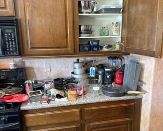 Kitchen includes small appliances, dishes, pots and pans.