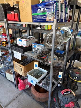 Whole house full of stuff…garage type tools and pool supplies, garden decor, BB guns, refrigerator, beautiful bedroom set, wicker bedroom, dining table set with hutch, curio cabinet, formal dining table with 2 leaves and 6 chairs.